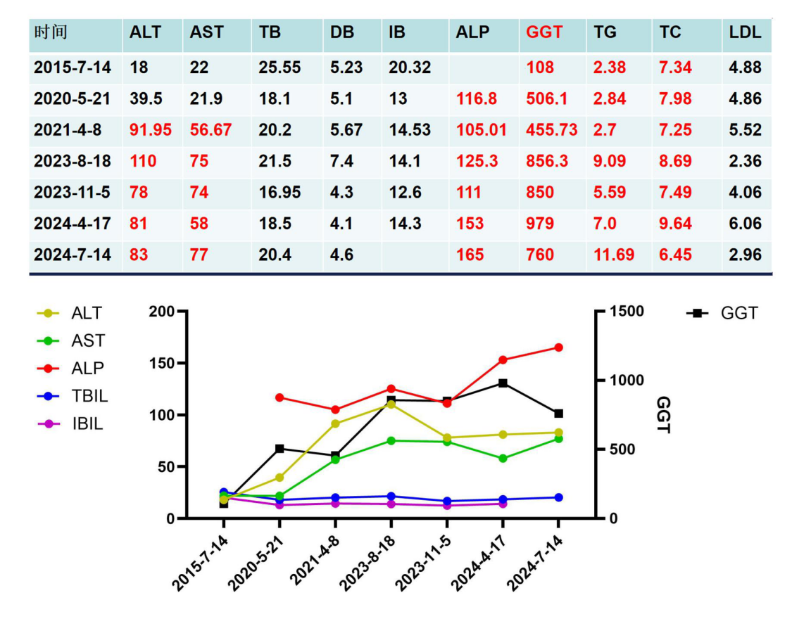 现病史:10年前患者体检时发现肝功能异常,GGT 108U/L,转氨酶正常。平素偶有疲乏感,无厌油、纳差、皮肤瘙痒、皮肤巩膜黄染等不适症状。外院检查病毒性肝炎标志物、ANA、AMA-M2等免疫指标未见异常,B超提示轻度脂肪肝。此后患者间断复查GGT进行性升高波动于108-979U/L,ALP、ALT、AST轻度升高(ALP 105-165U/L,ALT 78-110U/L,AST 56-77U/L),伴轻度高间接胆红素血症和高脂血症。患者间断口服熊去氧胆酸治疗,效果不佳,为进一步诊治就诊于我院门诊。患者平素体健,精神、食欲、睡眠可,大小便正常,体重稳定。