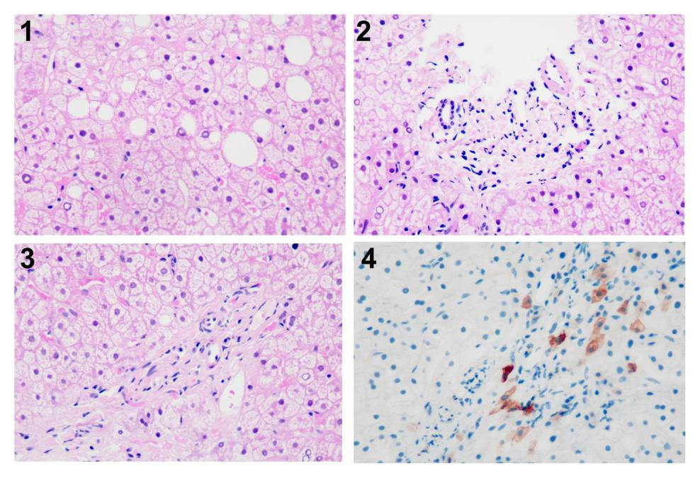 肝穿病理: 1、小叶内未见明显炎症坏死,肝细胞空泡变性及大泡性脂变(图2.1 H&E 400x);2、汇管区轻度纤维化,间质炎症轻,多可见小叶间胆管(图2.2 H&E 400x);3、部分汇管区未见小动脉伴行小胆管(图2.3 H&E 400x);4、CK7免疫染色示汇管区未见小胆管,周围散在肝细胞呈阳性反应(图2.4 CK7 400x)。