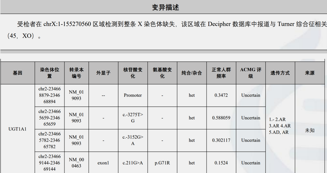 发现与受检者临床表型相关的致病性变异:受检者在chrX:1-155270560区域检测到整条X染色体缺失,该区域在Decipher数据库中报道与Turner综合征相关(45.XO)。