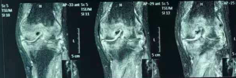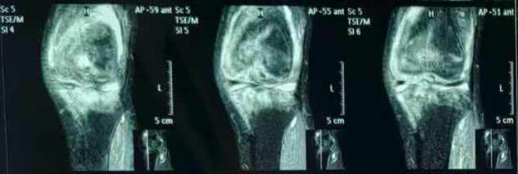 图1. 股骨、胫骨下斑片状、弥漫样高信号,提示骨髓水肿/炎性浸润